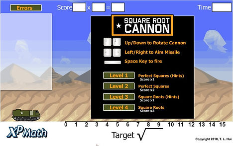 Seleccione el nivel 1, 2, 3 o 4. En el juego, halle la raíz cuadrada del número que aparece debajo del plano; con las teclas arriba o abajo cambia el ángulo de disparo del cañón, presione la barra espaciadora para disparar y eliminar el tanque.